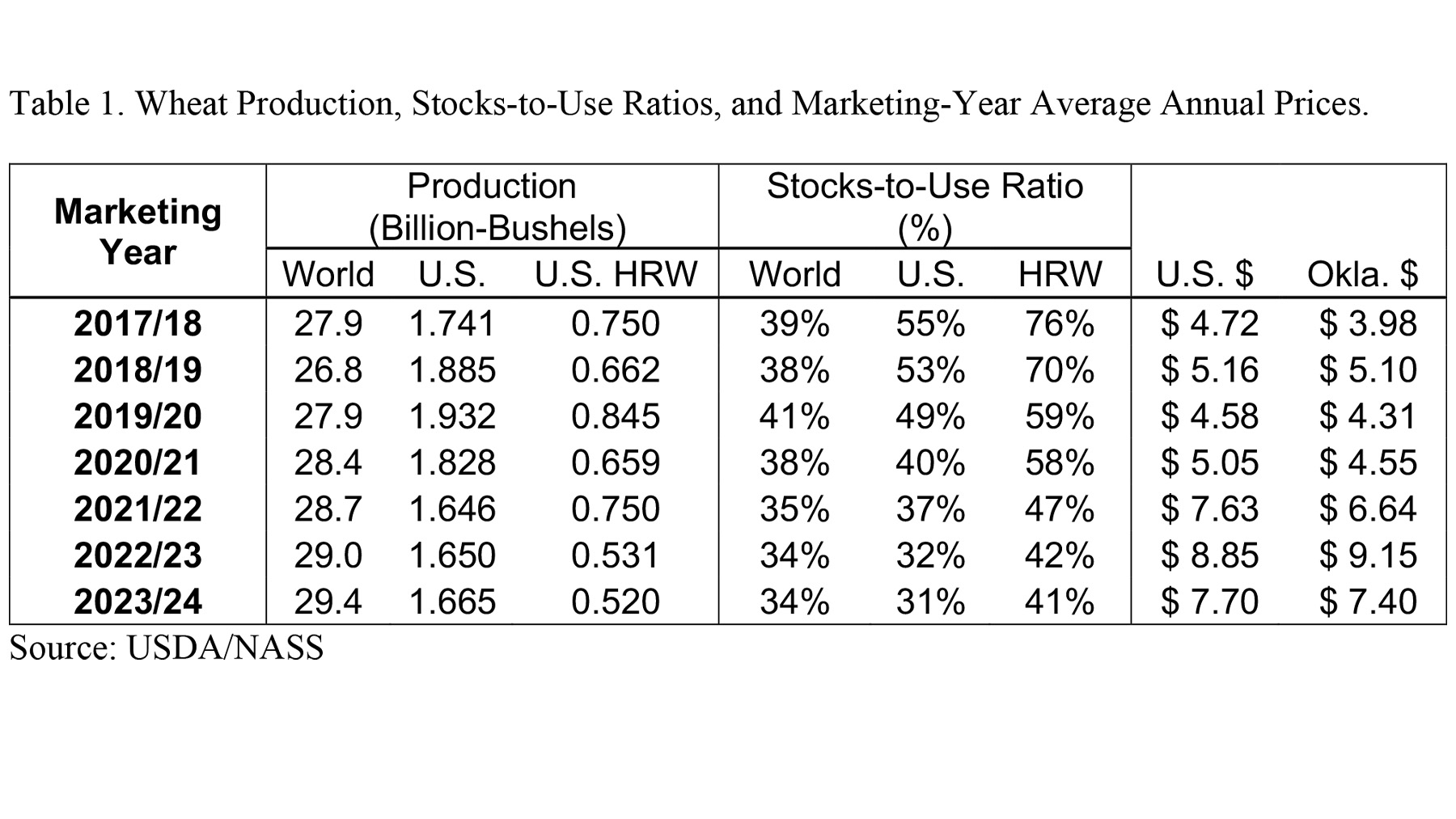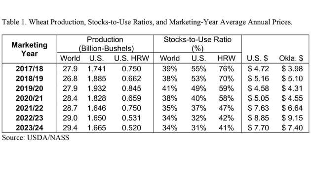 The U.S. and U.S. HRW stock-to-use ratios declined every year from the highs set in 2017/18. The HRW stocks-to-use ratios declined from 76% in 2017/18 to a projected 41% for 2023/24. These lower stocks-to-use ratios caused Oklahoma’s HRW average annual marketing-year price to increase from $3.98 in 2017/18 to $9.15 in 2022/23.